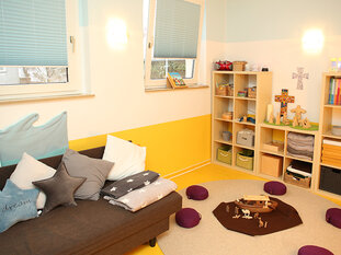In der religionspädagogischen Arbeit ist das Konzept „Gott im Spiel“ fest verankert. „Gott im Spiel“ ist eine Form spiritueller Bildung und basiert auf den Prinzipien der Pädagogik von Maria Montessori. Es möchte den Kindern mit speziell entwickelten Materialien die Möglichkeit geben, Spiritualität zu entdecken und wachsen zu lassen. Dabei sind besonders das Spiel und das „In -Geschichten – Leben“ zwei wesentliche Formen der kindlichen Welterschließung. Die Kinder in dieser Kita können Gott hörend und spielend im „Gott im Spiel-Raum“ begegnen und dabei selbst erspüren und entdecken, wer Gott eigentlich ist. Die Arbeit mit diesem Konzept besteht aus angeleiteten Einheiten und dem Erzählen und Erleben von Glaubensgeschichten, Gleichnissen und liturgischen Handlungen mit dem Ziel, dass die Kinder ihren eigenen Lebensglauben finden. Es eröffnen sich Wege des Staunens und Fragens. „Gott im Spiel“ ist ein imaginativer Ansatz, der die Fantasie und die Vorstellungen der Kinder unterstützt und fördert. Im Freispiel vertiefen die Kinder ihre Erfahrungen durch Spielen und kreatives Tun.